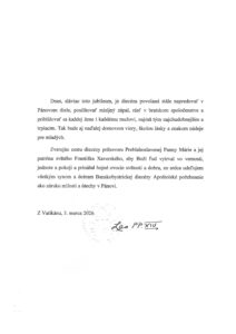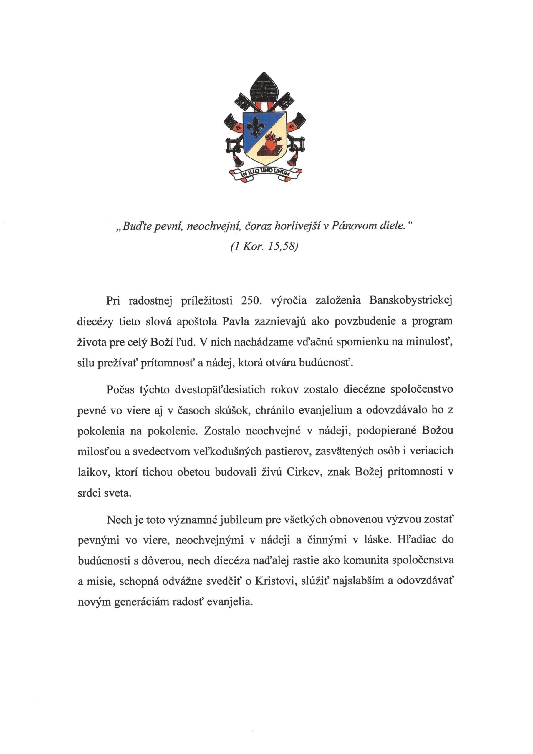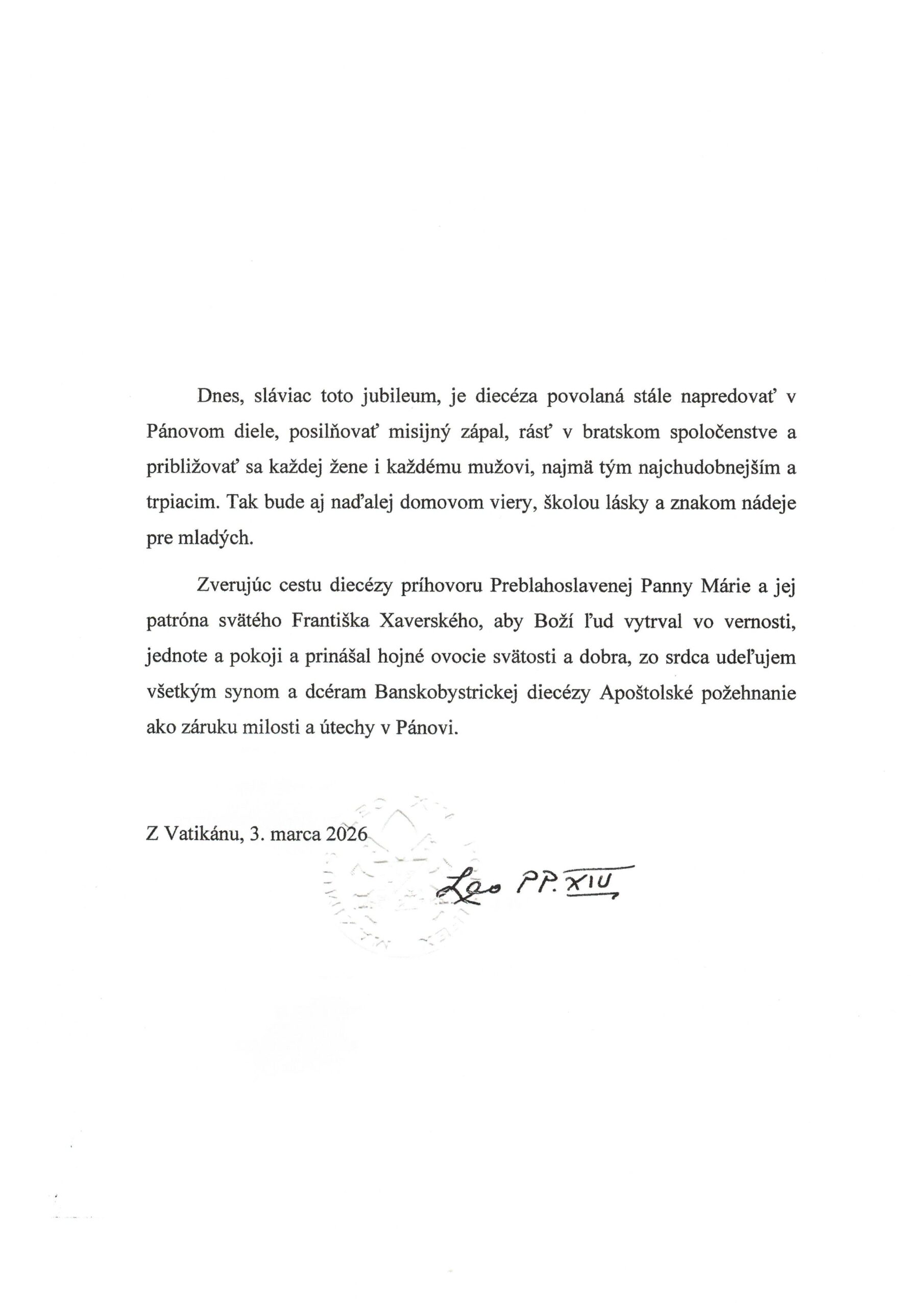 „Hľadiac do budúcnosti s dôverou, nech diecéza naďalej rastie ako komunita spoločenstva a misie, schopná odvážne svedčiť o Kristovi, slúžiť najslabším a odovzdávať novým generáciám radosť evanjelia,“ okrem iného uvádza list od Svätého Otca. S listom prišla aj medaila Leva XIV. vydaná v prvom roku jeho pontifikátu.